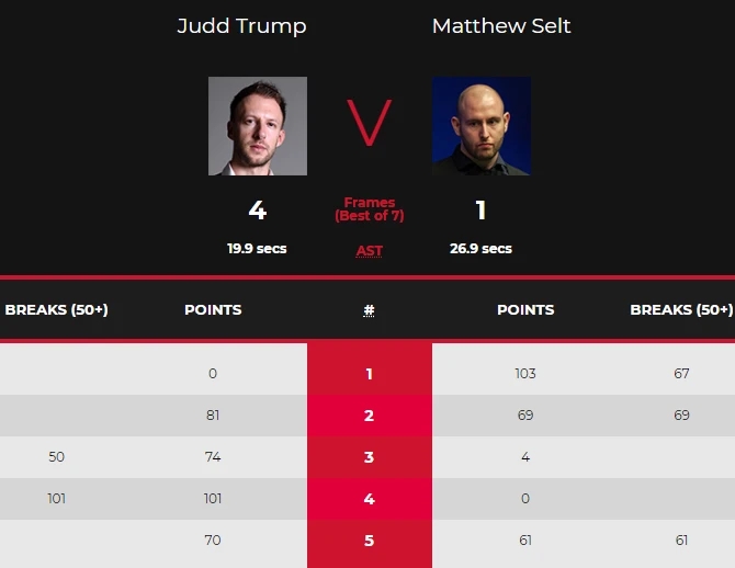 第一局特鲁姆普出师不利,塞尔特单杆67分、103-0零封,1-0拿到开门红。第二局,塞尔特虽然打出了单杆69分,但失误送出机会,特鲁姆普多杆上手,81-69险胜,1-1扳平。