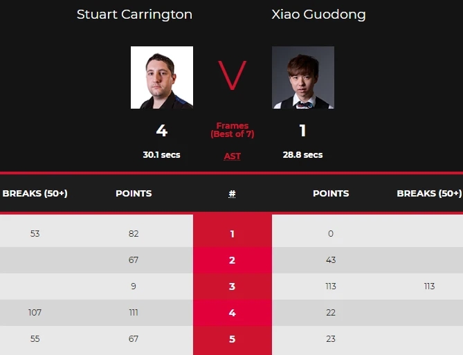 第一局,开局两人都没有好机会,卡林顿率先入局,单杆53分、53-0领先,肖国栋打丢中袋,卡林顿再上手超分拿下,82-0零封。第二局,卡林顿17-0中断,肖国栋长台拿到个人全场第一分,43分后失误,卡林顿上手扩大分差,67-43再下一城,肖国栋0-2落后。