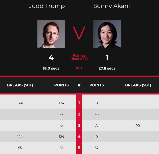 第四局,特鲁姆普又是单杆124分、124-0零封,3-1拿到赛点。第五局,特鲁姆普30分后中断,不过宋沙瓦打到37分后失误中断,特鲁姆普再上手,单杆55分、85-37拿下,4-1轻松晋级。