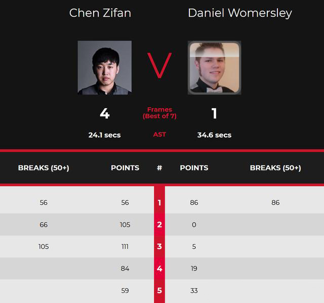 第四局,陈子凡率先上手,38分后中断,海莫斯利追回了19分,但陈子凡再度上手扩大分差完成超分,清台拿下,84-19,大分3-1拿到了赛点。