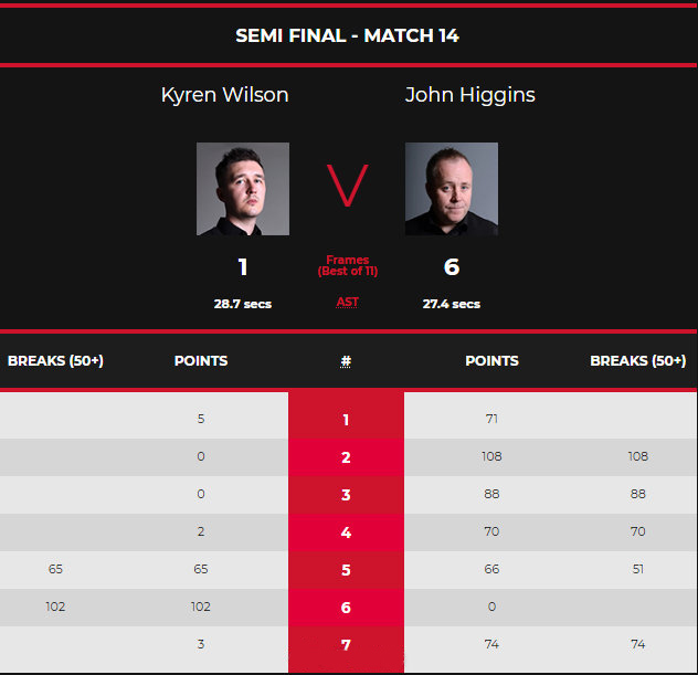 第七局,希金斯再也没有给威尔逊机会,他重新找到进攻手感,打出单杆74分,74-3锁定胜局,总比分6-1横扫晋级决赛。决赛,他的对手是老对手“火箭”罗尼-奥沙利文。