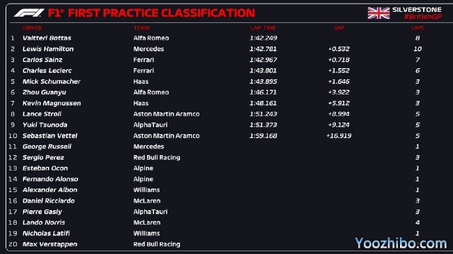 优直播讯 2022年F1英国大奖赛第1次练习赛在银石赛道结束,受到雨水影响,只有一半车手在赛道上做出了有效成绩。阿尔法罗密欧车队博塔斯拿到了单圈最速,汉密尔顿和小塞恩斯二三位。中国车手周冠宇第六。希望北京时间23点的二练可以让大家尽情发挥!