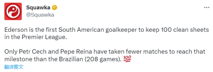 优直播讯03月05日赛后,据Squawka报道,埃德森本场完成了他个人在英超联赛的第100场零封,他也成为了首位在英超零封100场的南美门将。