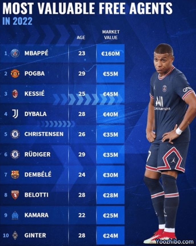 2022年夏天合同到期球员身价排名:
