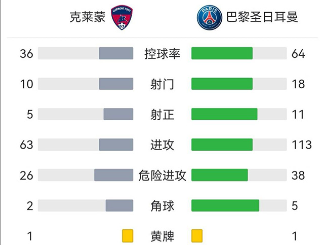 全场比赛结束,巴黎圣日耳曼6-1克莱蒙。