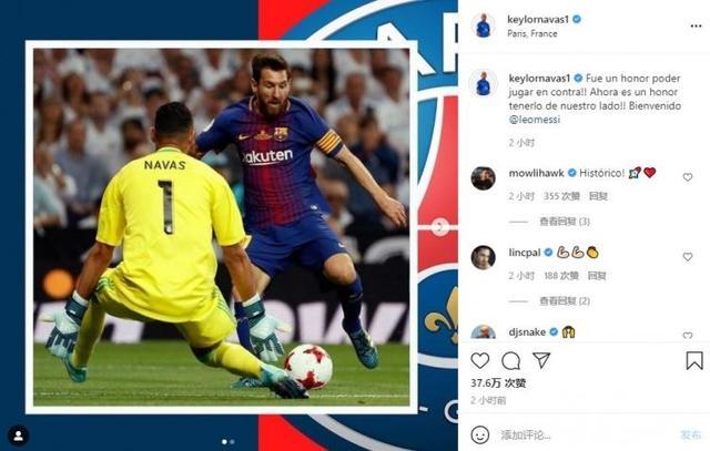 优直播讯 北京时间8月13日,巴黎门将纳瓦斯i在Ins上发文欢迎梅西加盟球队。