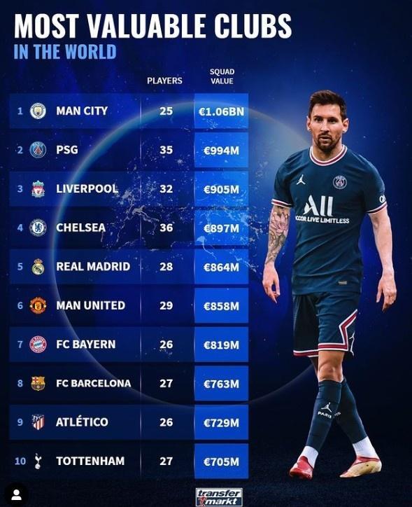 优直播讯 今日,《转会市场》统计了俱乐部总身价情况,其中,曼城位居榜首,刚刚引进梅西的巴黎位居次席