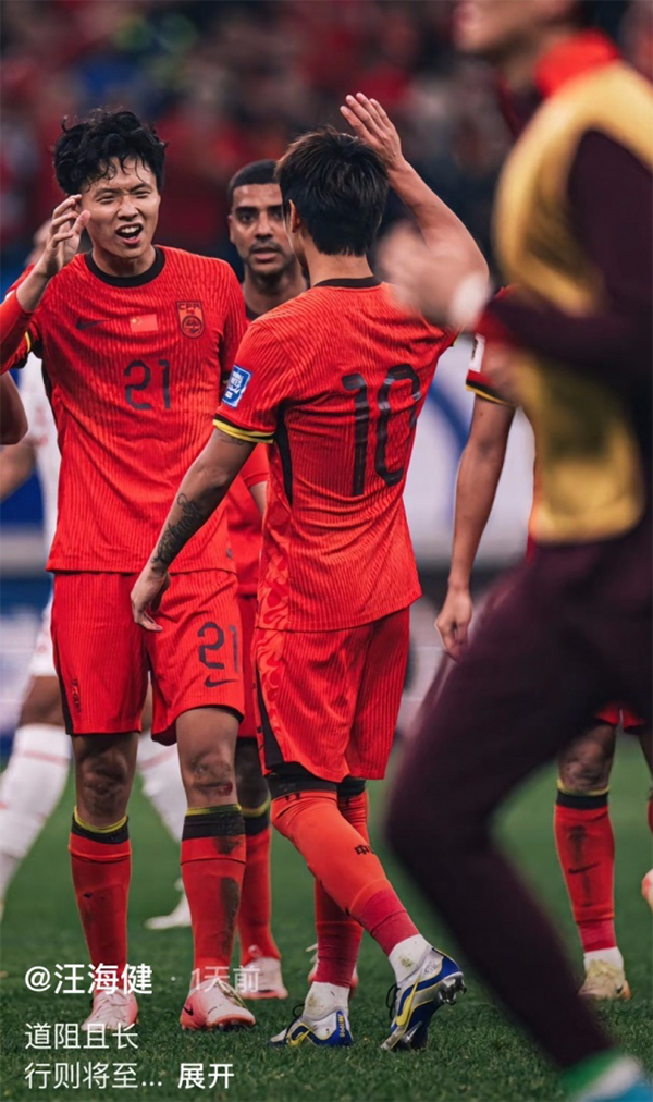 汪海健在社媒晒照并配文写道:“道阻且长,行则将至!中国队加油!”汪海健的这两句话,可谓颇具深意。