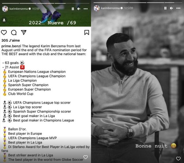 在本泽马晒出的数据中,他在该奖项评选期间贡献了63球21助,拿到了6个冠军,分别是欧冠冠军、西甲冠军、西班牙超级杯冠军、欧洲超级杯冠军、世俱杯冠军,欧国联冠军(国家队)。
