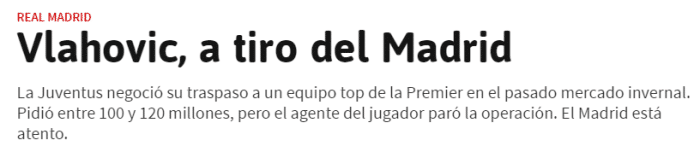 优直播02月2日讯 据西班牙媒体《阿斯报》报道,皇马可能在今夏签下尤文的塞尔维亚中锋弗拉霍维奇。