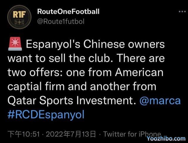 来源:优直播07-14 16:57优直播07月14日讯 晚,来自马卡电台Pericos Marca的消息,西甲劲旅西班牙人俱乐部老板陈雁升,正在计划出售俱乐部。目前这位中国老板已经收到了两份报价,一份来自北美的美国资本,另一份来自卡塔尔集团,后者正是法甲霸主巴黎圣日耳曼队的“金主”。