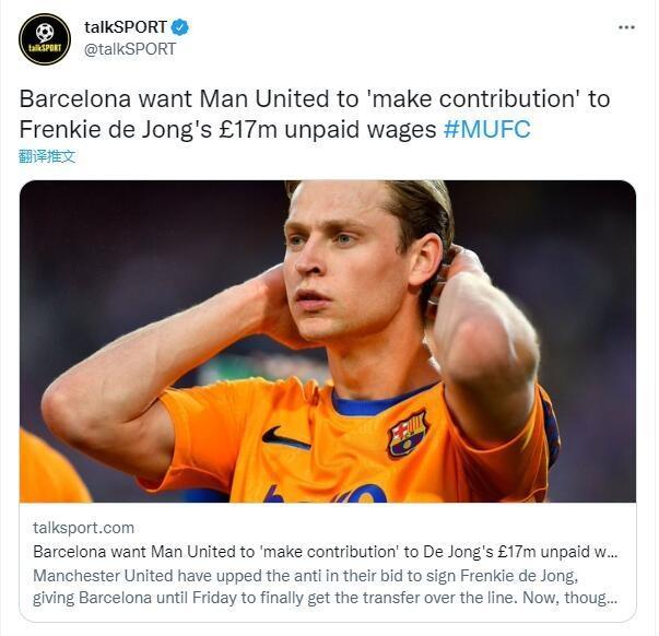 talkSPORT电台主持人亚历克斯-克鲁克表示:“德容显然希望在和曼联谈判之前解决被巴萨欠薪的问题,有消息人士向我透露,巴萨真正想要的是曼联为这个欠薪做出一些财政上的贡献。”