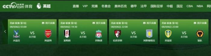 好球直播吧07月12日讯 央视官网节目单上已经出现了新赛季英超转播预告,比如富勒姆对利物浦,水晶宫对阿森纳,伯恩茅斯对维拉,利兹联对狼队。