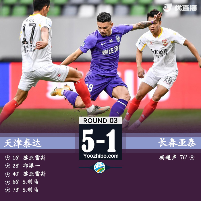 优直播讯:北京时间12月1日15:00,足协杯展开第三轮较量,天津泰达迎战长春亚泰。苏亚雷斯打破僵局,第27分钟,邱添一头球破门得分,随后苏亚雷斯完成梅开二度,泰达3-0领先亚泰。
